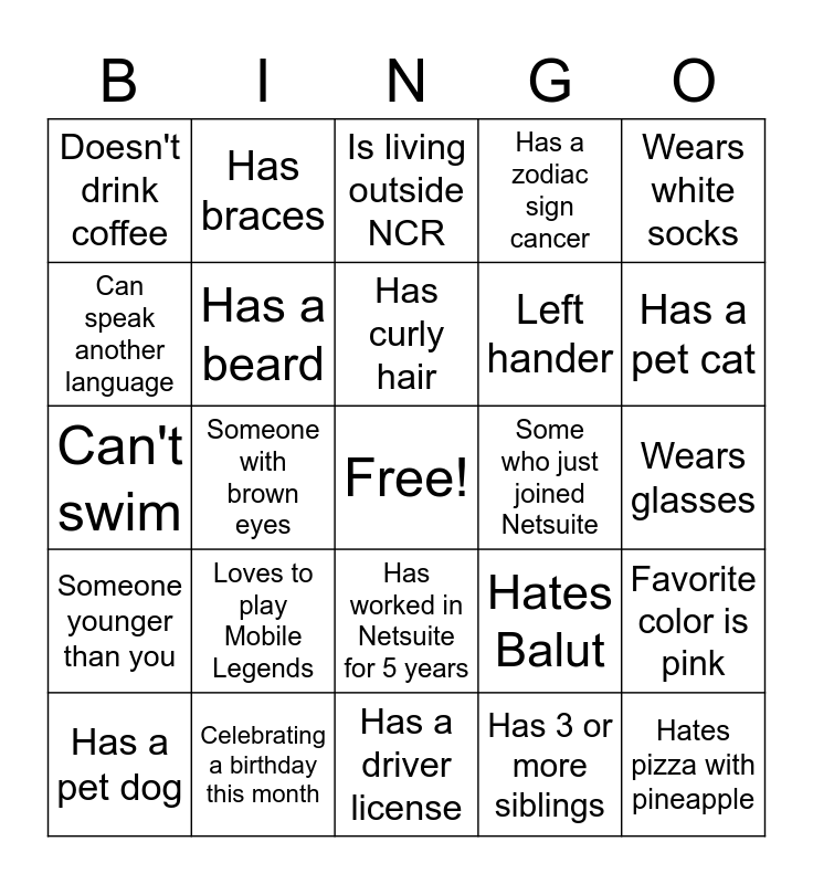 This bingo card has a free space and 24 words: Loves to play Mobile Legends, Celebrating a birthday this month, Has curly hair, Has a pet dog, Wears white socks, Doesn't drink coffee, Can speak another language, Has braces, Some who just joined Netsuite, Has worked in Netsuite for 5 years, Left hander, Can't swim, Hates Balut, Favorite color is pink, Has a beard, Has 3 or more siblings, Wears glasses, Is living outside NCR, Has a pet cat, Someone with brown eyes, Hates pizza with pineapple, Someone younger than you, Has a zodiac sign cancer and Has a driver license.