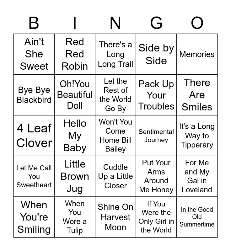 This bingo card has a free space and 30 words: When You Wore a Tulip, K-K-Katy, Hello My Baby, Have You Ever Been Lonely, Ain't She Sweet, There's a Long Long Trail, Oh!You Beautiful Doll, Cuddle Up a Little Closer, Sentimental Journey, Shine On Harvest Moon, It's a Long Way to Tipperary, In the Good Old Summertime, If You Were the Only Girl in the World, Darktown Strutters' Ball, There Are Smiles, Five Foot Two, Put Your Arms Around Me Honey, Let Me Call You Sweetheart, Little Brown Jug, Memories, 4 Leaf Clover, If You Knew Susie, Red Red Robin, Pack Up Your Troubles, Bye Bye Blackbird, Side by Side, For Me and My Gal in Loveland, When You're Smiling, Let the Rest of the World Go By and Heart of my Heart.
