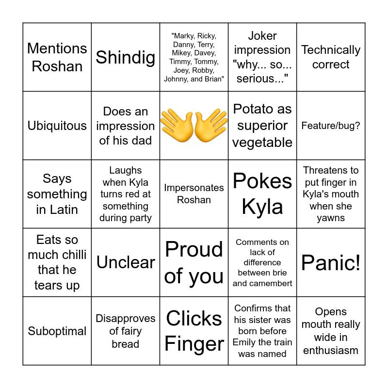 This bingo card has 1 images and 24 words: Unclear, Clicks Finger, Suboptimal, Technically correct, Mentions Roshan, Ubiquitous, Shindig, Pokes Kyla, Proud of you, Potato as superior vegetable, Says something in Latin, Comments on lack of difference between brie and camembert, Panic!, Does an impression of his dad, Opens mouth really wide in enthusiasm, Threatens to put finger in Kyla's mouth when she yawns, "Marky, Ricky, Danny, Terry, Mikey, Davey, Timmy, Tommy, Joey, Robby, Johnny, and Brian", Feature/bug?, Laughs when Kyla turns red at something during party, Impersonates Roshan, Disapproves of fairy bread, Eats so much chilli that he tears up, Joker impression "why... so... serious..." and Confirms that his sister was born before Emily the train was named.