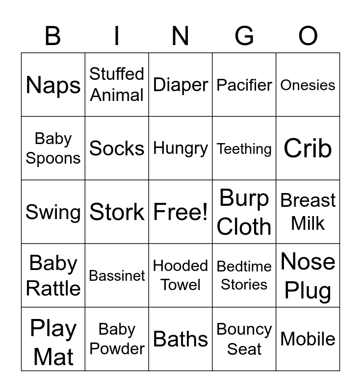 This bingo card has a free space and 44 words: Sippy Cup, Mobile, Bottle Brush, Play Mat, Teething Ring, Bouncy Seat, Diaper, Wash Cloth, Onesies, Baby Powder, Pacifier, Burp Cloth, Hooded Towel, Bassinet, Baby Wipes, Baths, Diaper Cream, Swing, Receiving Blanket, Crib, Stuffed Animal, Crawl, Safety Gates, Naps, Walker, Breast Milk, Toys, Tummy Time, Bedtime Stories, Baby Rattle, Lotion, Nose Plug, Giggles, Baby Saucer, Stork, Blow Bubbles, Dreaming, Baby Monitor, Hungry, Baby Spoons, Teething, Bath Tub, Socks and Diaper Change.