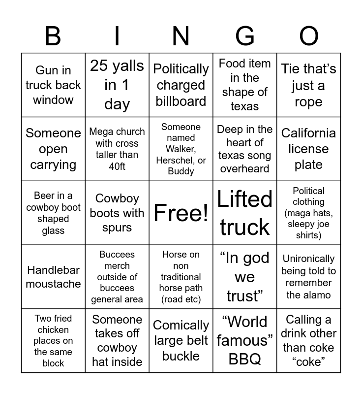 This bingo card has a free space and 26 words: Horse on non traditional horse path (road etc), “World famous” BBQ, Someone named Walker, Herschel, or Buddy, Someone takes off cowboy hat inside, Tie that’s just a rope, Gun in truck back window, Someone open carrying, 25 yalls in 1 day, Political clothing (maga hats, sleepy joe shirts), “In god we trust”, Deep in the heart of texas song overheard, Beer in a cowboy boot shaped glass, Unironically being told to remember the alamo, Two fried chicken places on the same block, Cowboy boots with spurs, Something described as “texas sized”, Food item in the shape of texas, Handlebar moustache, Politically charged billboard, Calling a drink other than coke “coke”, California license plate, Comically large belt buckle, Lifted truck, Buccees merch outside of buccees general area, Mega church with cross taller than 40ft and 5 complaints about heat/humidity in 30min.