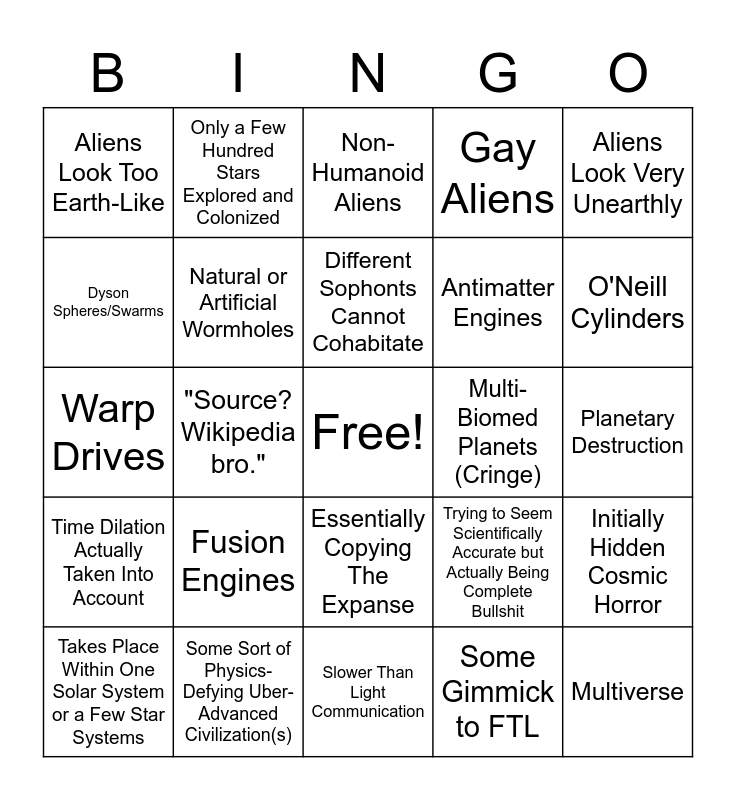 This bingo card has a free space and 24 words: Fusion Engines, Some Sort of Physics-Defying Uber-Advanced Civilization(s), Different Sophonts Cannot Cohabitate, Takes Place Within One Solar System or a Few Star Systems, Aliens Look Very Unearthly, Aliens Look Too Earth-Like, Dyson Spheres/Swarms, Only a Few Hundred Stars Explored and Colonized, Multi-Biomed Planets (Cringe), Essentially Copying The Expanse, Antimatter Engines, Warp Drives, Trying to Seem Scientifically Accurate but Actually Being Complete Bullshit, Initially Hidden Cosmic Horror, Natural or Artificial Wormholes, Some Gimmick to FTL, Planetary Destruction, Non-Humanoid Aliens, O'Neill Cylinders, "Source? Wikipedia bro.", Multiverse, Time Dilation Actually Taken Into Account, Gay Aliens and Slower Than Light Communication.
