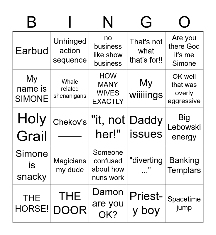 This bingo card has a free space and 24 words: Magicians my dude, THE DOOR, HOW MANY WIVES EXACTLY, THE HORSE!, Are you there God it's me Simone, Earbud, My name is SIMONE, Unhinged action sequence, Daddy issues, Someone confused about how nuns work, My wiiiiings, Holy Grail, "diverting ...", Banking Templars, Whale related shenanigans, Priest-y boy, Big Lebowski energy, no business like show business, OK well that was overly aggressive, Chekov's _____, Spacetime jump, Simone is snacky, That's not what that's for!! and Damon are you OK?.