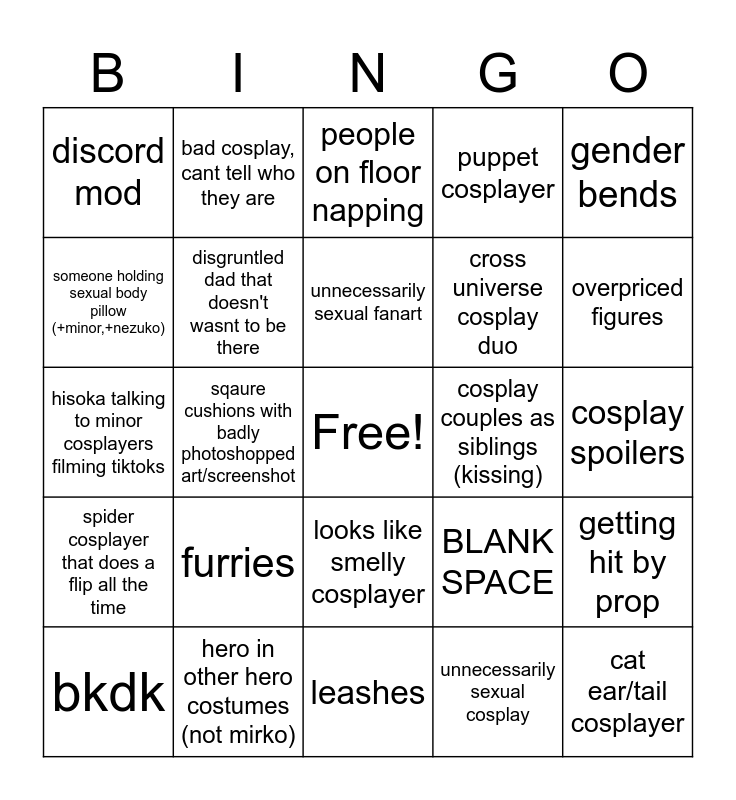 This bingo card has a free space and 25 words: furries, leashes, unnecessarily sexual fanart, bkdk, gender bends, discord mod, someone holding sexual body pillow (+minor,+nezuko), bad cosplay, cant tell who they are, cosplay couples as siblings (kissing), looks like smelly cosplayer, cross universe cosplay duo, hisoka talking to minor cosplayers filming tiktoks, BLANK SPACE, getting hit by prop, disgruntled dad that doesn't wasnt to be there, overly enthusiastic parent, cosplay spoilers, people on floor napping, overpriced figures, sqaure cushions with badly photoshopped art/screenshot, cat ear/tail cosplayer, hero in other hero costumes (not mirko), spider cosplayer that does a flip all the time, puppet cosplayer and unnecessarily sexual cosplay.