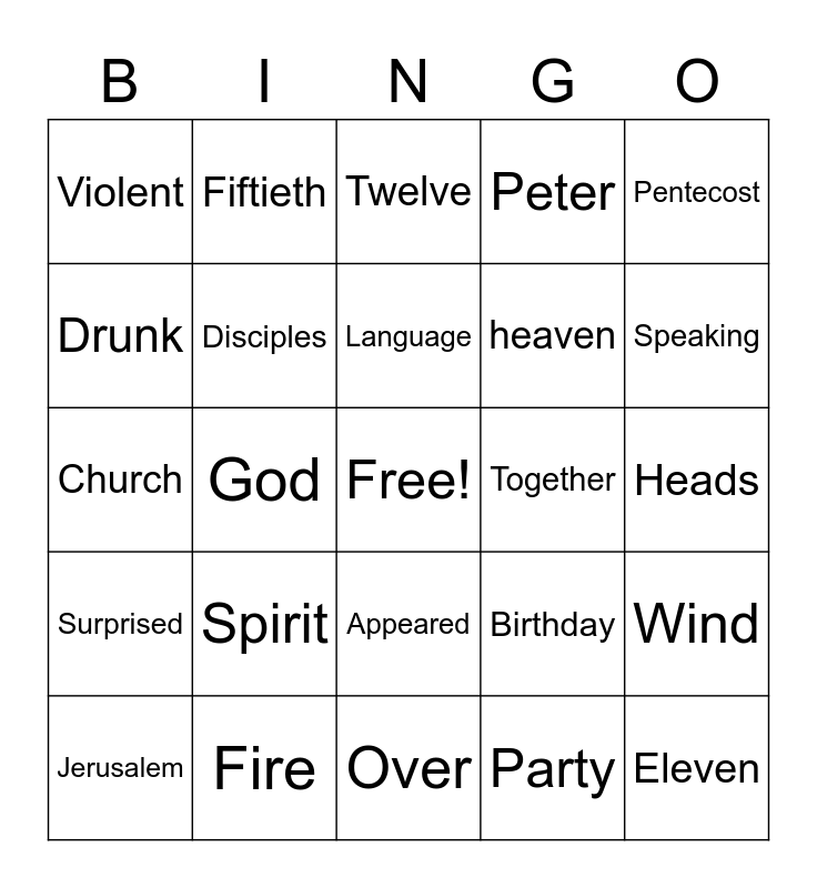 This bingo card has a free space and 38 words: Flames, Holy, Jesus, Disciples, Wind, Spirit, Language, Tongues, Pentecost, heaven, God, Peter, Eleven, Heads, Drunk, Surprised, Gathered, Twelve, Crowd, Together, Violent, Fire, Speaking, Jerusalem, Amazed, Over, Apostles, Blowing, Fear, Promise, Trinity, Appeared, Party, Fiftieth, Believers, Birthday, Church and Celebration.