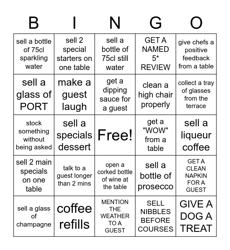 This bingo card has a free space and 24 words: talk to a guest longer than 2 mins, coffee refills, get a dipping sauce for a guest, sell a glass of champagne, give chefs a positive feedback from a table, sell a bottle of 75cl sparkling water, sell a glass of PORT, sell 2 special starters on one table, get a "WOW" from a table, open a corked bottle of wine at the table, clean a high chair properly, stock something without being asked, sell a bottle of prosecco, GET A CLEAN NAPKIN FOR A GUEST, make a guest laugh, SELL NIBBLES BEFORE COURSES, sell a liqueur coffee, sell a bottle of 75cl still water, collect a tray of glasses from the terrace, sell a specials dessert, GIVE A DOG A TREAT, sell 2 main specials on one table, GET A NAMED 5* REVIEW and MENTION THE WEATHER TO A GUEST.