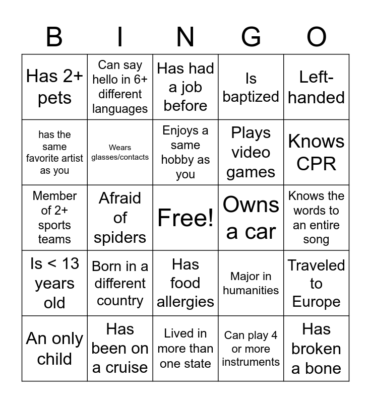 This bingo card has a free space and 25 words: Born in a different country, Lived in more than one state, Enjoys a same hobby as you, An only child, Left-handed, Has 2+ pets, has the same favorite artist as you, Can say hello in 6+ different languages, Owns a car, Has food allergies, Plays video games, Member of 2+ sports teams, Major in humanities, Traveled to Europe, Wears glasses/contacts, Likes pineapple on pizza, Knows the words to an entire song, Has had a job before, Knows CPR, Afraid of spiders, Has broken a bone, Has been on a cruise, Is < 13 years old, Is baptized and Can play 4 or more instruments.