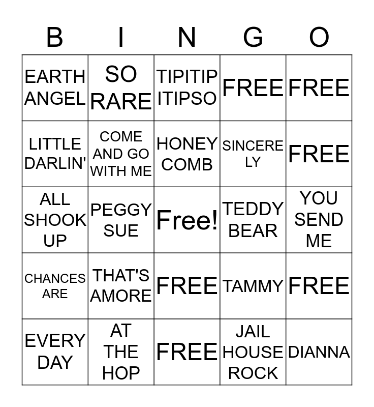 This bingo card has a free space and 24 words: THAT'S AMORE, AT THE HOP, HONEY COMB, EVERY DAY, FREE, EARTH ANGEL, LITTLE DARLIN', SO RARE, TEDDY BEAR, FREE, SINCERE LY, ALL SHOOK UP, TAMMY, FREE, COME AND GO WITH ME, JAIL HOUSE ROCK, YOU SEND ME, TIPITIP ITIPSO, FREE, PEGGY SUE, DIANNA, CHANCES ARE, FREE and FREE.