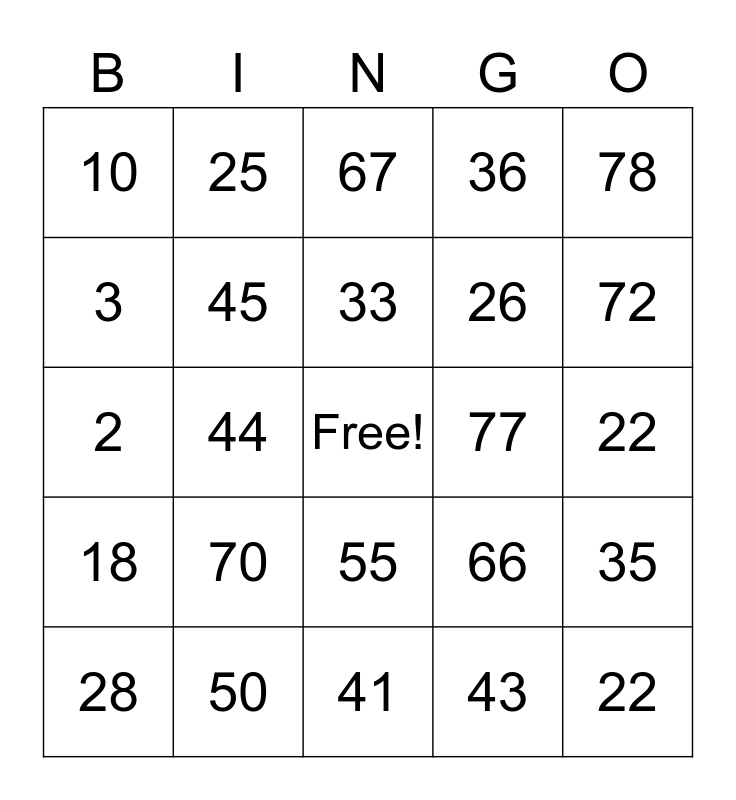 This bingo card has a free space and 24 words: 28, 70, 33, 43, 78, 10, 25, 67, 77, 22, 2, 45, 66, 35, 3, 50, 41, 36, 72, 18, 44, 55, 26 and 22.