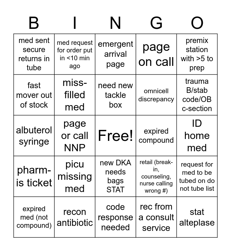 This bingo card has a free space and 46 words: compatibility question, stat alteplase, temperature/pressure alarm, code response needed, picu missing med, nurse has <1 hour on a drip, med request for order put in <10 min ago, need med from central or nurse requesting item that comes from central, fast mover out of stock, tube station down, miss-filled med, page on call, request for med to be tubed on do not tube list, retail (break-in, counseling, nurse calling wrong #), call to borrow a med, med message requesting drug in omnicell, need new tackle box, expired compound, smog compound, premix station with >5 to prep, page or call NNP, rec from a consult service, med sent secure returns in tube, omnicell discrepancy, med not scanning (doseedge or nurse call), trauma B/stab code/OB c-section, expired med (not compound), call from OR, new DKA needs bags STAT, pharm-is ticket, doseedge bypass, new LOS/EOS orders, call from outside pharm to borrow med, tube shut down for full tube, request for vfc vaccine, recon antibiotic, ID home med, status board clear, request for on call electrolytes, omnicell issue, med message requesting med scanned into med bin, emergent arrival page, albuterol syringe, phone call from MD needing dose recommendation, critical dose warning override and med stored improperly.