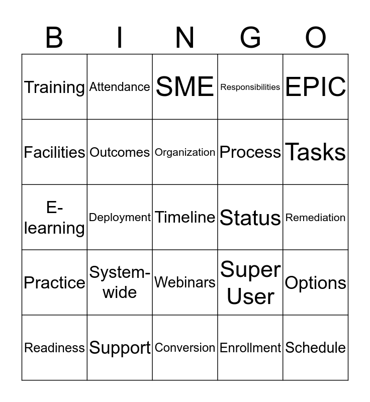 This bingo card has a free space and 57 words: SuperNova, Readiness, Kickoff, Training, Conversion, Objectives, Outcomes, Communication, Process, Leadership, Responsibilities, Roles, Documentation, Checklist, Clinical, Tactical, EPIC, Deployment, Go-Live, Schedule, Status, Classroom, Super User, SME, Guiding Principles, Organization, Decisions, SWAT, Tasks, Implementation, Launch, Performance, Preparation, Countdown, Remediation, Facilities, Immersions, E-learning, Shadowing, Practice, Attendance, Webinars, Dry Run, Facilitate, Advisory, Councils, System-wide, Support, Troubleshoot, Partner, Revenue, Enrollment, Survey, Best Practice, Impact, Options and Interface.