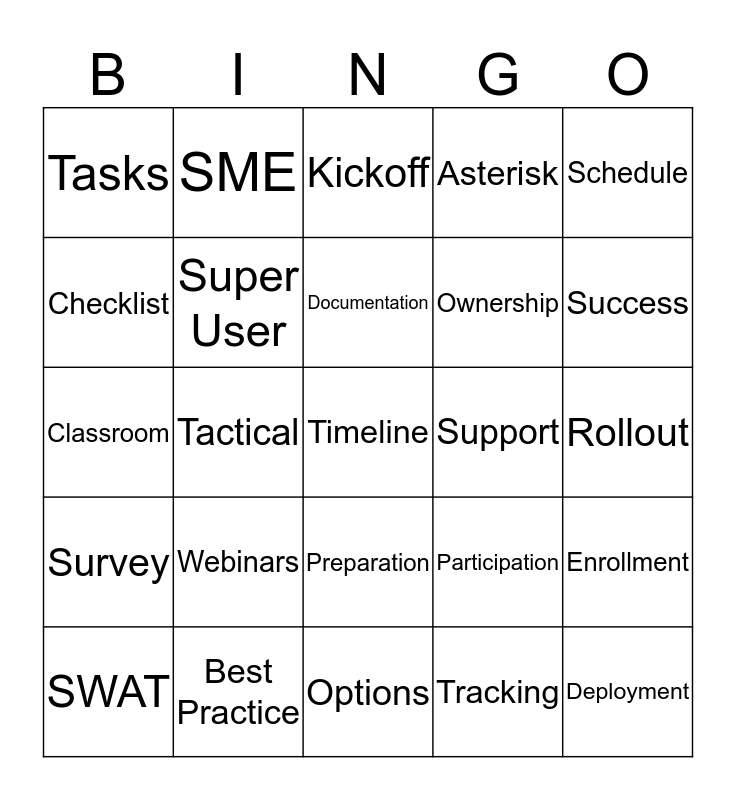 This bingo card has a free space and 76 words: SuperNova, Readiness, Kickoff, Training, Conversion, Objectives, Outcomes, Communication, Process, Leadership, Responsibilities, Roles, Documentation, Checklist, Clinical, Tactical, EPIC, Deployment, Go-Live, Schedule, Status, Classroom, Super User, SME, Asterisk, Education, Rehearsal, Administrators, Milestones, Assessments, Playground, Validation, Active, Participation, Success, Ownership, Core Build, Workflow, Rollout, Tracking, Data, Equipment, Appointment, Guiding Principles, Organization, Decisions, SWAT, Tasks, Implementation, Launch, Performance, Preparation, Countdown, Remediation, Facilities, Immersions, E-learning, Shadowing, Practice, Attendance, Webinars, Dry Run, Facilitate, Advisory, Councils, System-wide, Support, Troubleshoot, Partner, Revenue, Enrollment, Survey, Best Practice, Impact, Options and Interface.
