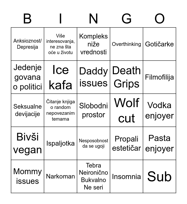 This bingo card has a free space and 24 words: Ispaljotka, Narkoman, Daddy issues, Mommy issues, Gotičarke, Anksioznost/ Depresija, Jedenje govana o politici, Više interesovanja, ne zna šta oće u životu, Wolf cut, Nesposobnost da se ugoji, Death Grips, Seksualne devijacije, Propali estetičar, Pasta enjoyer, Ice kafa, Insomnia, Vodka enjoyer, Kompleks niže vrednosti, Filmofilija, Čitanje knjiga o random nepovezanim temama, Sub, Bivši vegan, Overthinking and Tebra Neironično Bukvalno Ne seri.
