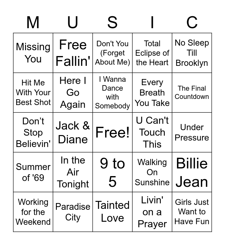 This bingo card has a free space and 25 words: In the Air Tonight, Tainted Love, I Wanna Dance with Somebody, Working for the Weekend, No Sleep Till Brooklyn, Missing You, Hit Me With Your Best Shot, Free Fallin', U Can't Touch This, 9 to 5, Every Breath You Take, Don’t Stop Believin', Walking On Sunshine, Billie Jean, Here I Go Again, Footloose, Under Pressure, Don't You (Forget About Me), The Final Countdown, Jack & Diane, Girls Just Want to Have Fun, Paradise City, Summer of '69, Total Eclipse of the Heart and Livin' on a Prayer.