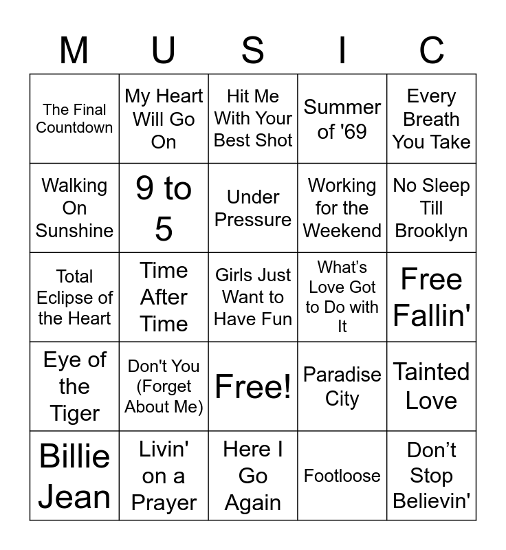 This bingo card has 26 words: Free!, Footloose, Under Pressure, Livin' on a Prayer, Every Breath You Take, The Final Countdown, Walking On Sunshine, My Heart Will Go On, Free Fallin', Paradise City, Working for the Weekend, Total Eclipse of the Heart, Tainted Love, Billie Jean, Time After Time, I Just Died In Your Arms Tonight, Summer of '69, Eye of the Tiger, Hit Me With Your Best Shot, Girls Just Want to Have Fun, No Sleep Till Brooklyn, Here I Go Again, What’s Love Got to Do with It, Don't You (Forget About Me), 9 to 5 and Don’t Stop Believin'.