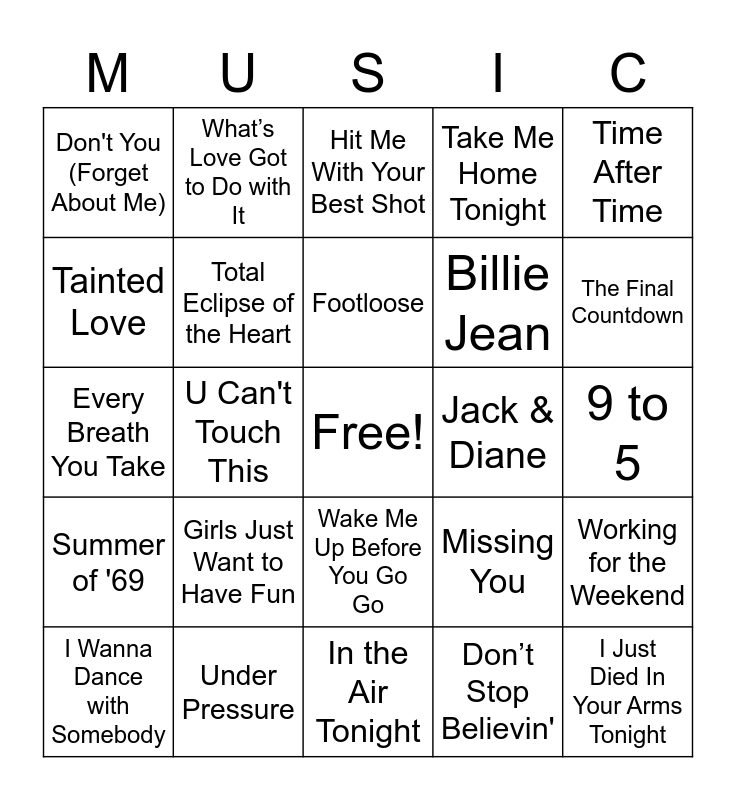 This bingo card has a free space and 24 words: Girls Just Want to Have Fun, Under Pressure, Footloose, I Wanna Dance with Somebody, Time After Time, Don't You (Forget About Me), Tainted Love, What’s Love Got to Do with It, Jack & Diane, Wake Me Up Before You Go Go, Billie Jean, Every Breath You Take, Missing You, Working for the Weekend, Total Eclipse of the Heart, Don’t Stop Believin', 9 to 5, Hit Me With Your Best Shot, The Final Countdown, U Can't Touch This, I Just Died In Your Arms Tonight, Summer of '69, Take Me Home Tonight and In the Air Tonight.