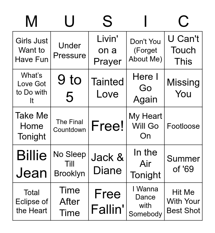 This bingo card has a free space and 24 words: No Sleep Till Brooklyn, Time After Time, Tainted Love, Total Eclipse of the Heart, U Can't Touch This, Girls Just Want to Have Fun, What’s Love Got to Do with It, Under Pressure, My Heart Will Go On, Jack & Diane, Here I Go Again, Take Me Home Tonight, In the Air Tonight, Summer of '69, 9 to 5, I Wanna Dance with Somebody, Footloose, Livin' on a Prayer, Missing You, The Final Countdown, Hit Me With Your Best Shot, Billie Jean, Don't You (Forget About Me) and Free Fallin'.