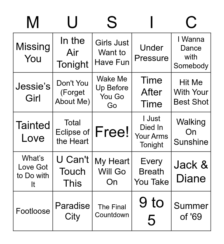 This bingo card has a free space and 24 words: U Can't Touch This, Paradise City, Wake Me Up Before You Go Go, Footloose, I Wanna Dance with Somebody, Missing You, Jessie’s Girl, In the Air Tonight, I Just Died In Your Arms Tonight, My Heart Will Go On, Time After Time, Tainted Love, Every Breath You Take, Jack & Diane, Don't You (Forget About Me), 9 to 5, Walking On Sunshine, Girls Just Want to Have Fun, Hit Me With Your Best Shot, Total Eclipse of the Heart, Summer of '69, What’s Love Got to Do with It, Under Pressure and The Final Countdown.