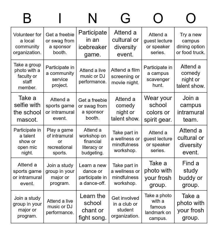 This bingo card has 75 words: Attend a welcome address from the university president., Take a photo with your frosh group., Participate in an icebreaker game., Join a campus tour and learn about key landmarks., Attend a faculty or program orientation session., Wear your school colors or spirit gear., Get involved in a club or student organization., Attend a themed costume party., Learn the school chant or fight song., Explore the campus library or study space., Attend a sports game or intramural event., Find a study buddy or group., Participate in a community service project., Try a new campus dining option or food truck., Play a game of intramural or recreational sports., Attend a comedy night or talent show., Take part in a wellness or mindfulness workshop., Take a selfie with the school mascot., Visit the student resource center or career services., Attend a guest lecture or speaker series., Attend a live music or DJ performance., Participate in a campus scavenger hunt., Take a group photo with a faculty or staff member., Get a freebie or swag from a sponsor booth., Attend a cultural or diversity event., Have a picnic on the campus green., Try a new fitness class or join a sports club., Attend a career fair or networking event., Explore the art gallery or exhibition on campus., Get a campus map and mark your favorite spots., Join a study group in your major or program., Attend a workshop on financial literacy or budgeting., Volunteer for a local community organization., Participate in a talent show or open mic night., Attend a film screening or movie night., Attend a live music or DJ performance., Participate in a campus scavenger hunt., Take a group photo with a faculty or staff member., Get a freebie or swag from a sponsor booth., Attend a cultural or diversity event., Have a picnic on the campus green., Try a new fitness class or join a sports club., Attend a career fair or networking event., Explore the art gallery or exhibition on campus., Get a campus map and mark your favorite spots., Join a study group in your major or program., Attend a workshop on financial literacy or budgeting., Volunteer for a local community organization., Participate in a talent show or open mic night., Attend a film screening or movie night., Learn a new dance or participate in a dance-off., Join a campus intramural team., Attend a panel discussion or debate., Take a photo with a famous landmark on campus., Attend a theater production or play., Attend a welcome address from the university president., Take a photo with your frosh group., Participate in an icebreaker game., Join a campus tour and learn about key landmarks., Attend a faculty or program orientation session., Wear your school colors or spirit gear., Get involved in a club or student organization., Attend a themed costume party., Learn the school chant or fight song., Explore the campus library or study space., Attend a sports game or intramural event., Find a study buddy or group., Participate in a community service project., Try a new campus dining option or food truck., Play a game of intramural or recreational sports., Attend a comedy night or talent show., Take part in a wellness or mindfulness workshop., Visit the student resource center or career services., Attend a guest lecture or speaker series. and Take a selfie with the school mascot..