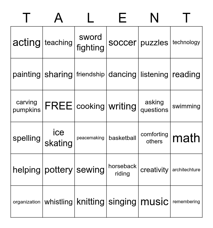 This bingo card has 41 words: singing, listening, gardening, painting, basketball, swimming, sharing, rock climbing, puzzles, writing, reading, soccer, carving pumpkins, cooking, FREE, asking questions, organization, acting, music, sword fighting, ice skating, helping, comforting others, friendship, remembering, creativity, math, storytelling, dancing, pottery, juggling, teaching, peacemaking, whistling, spelling, technology, sewing, architechture, knitting, horseback riding and gymnastics.