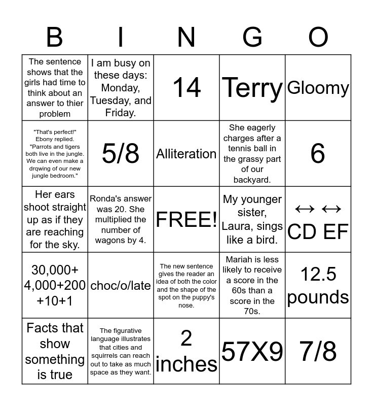 This bingo card has a free space and 24 words: choc/o/late, The figurative language illustrates that cities and squirrels can reach out to take as much space as they want., Alliteration, Facts that show something is true, Gloomy, The sentence shows that the girls had time to think about an answer to thier problem, "That's perfect!" Ebony replied. "Parrots and tigers both live in the jungle. We can even make a drqwing of our new jungle bedroom.", I am busy on these days: Monday, Tuesday, and Friday., My younger sister, Laura, sings like a bird., The new sentence gives the reader an idea of both the color and the shape of the spot on the puppy's nose., She eagerly charges after a tennis ball in the grassy part of our backyard., Her ears shoot straight up as if they are reaching for the sky., Mariah is less likely to receive a score in the 60s than a score in the 70s., 12.5 pounds, 5/8, 57X9, ↔ ↔ CD EF, 14, 6, Ronda's answer was 20. She multiplied the number of wagons by 4., 7/8, 30,000+ 4,000+200 +10+1, Terry and 2 inches.