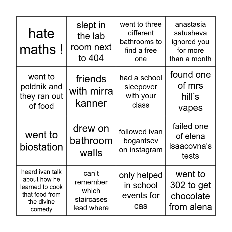 This bingo card has 16 words: heard ivan talk about how he learned to cook that food from the divine comedy, can’t remember which staircases lead where, went to three different bathrooms to find a free one, anastasia satusheva ignored you for more than a month, went to poldnik and they ran out of food, slept in the lab room next to 404, followed ivan bogantsev on instagram, failed one of elena isaacovna’s tests, hate maths !, friends with mirra kanner, only helped in school events for cas, found one of mrs hill’s vapes, went to biostation, drew on bathroom walls, had a school sleepover with your class and went to 302 to get chocolate from alena.