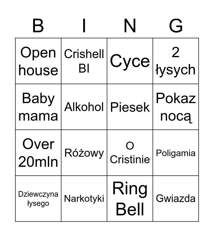 This bingo card has 16 words: Narkotyki, Poligamia, Cyce, Open house, Over 20mln, Crishell BI, O Cristinie, Ring Bell, Baby mama, Alkohol, Dziewczyna łysego, 2 łysych, Różowy, Pokaz nocą, Piesek and Gwiazda.
