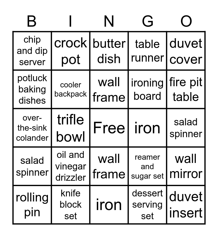 ⚠ This card has duplicate items: cocktail glasses (2), knife block set (2), cookie sheets (2), salad spinner (2), crock pot (2), roasting pan (2), cooler backpack (2), trifle bowl (2), ironing board (2), over-the-sink colander (2), table runner (2), oil and vinegar drizzler (2), potluck baking dishes (2), fire pit table (2), reamer and sugar set (2), chip and dip server (2), duvet insert (2), duvet cover (2), hand towels (2), wall frame (2), iron (2), butter dish (2), rolling pin (2), dessert serving set (2), domed server (2), sink drying mat (2), blanket basket (2), measuring cup (2), wall mirror (2), salad bowl and tongs (2), grill tool set (2)