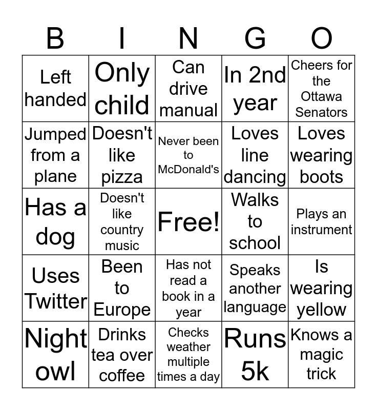 This bingo card has a free space and 24 words: Been to Europe, Drinks tea over coffee, Never been to McDonald's, Night owl, Cheers for the Ottawa Senators, Left handed, Jumped from a plane, Only child, Walks to school, Has not read a book in a year, Loves line dancing, Has a dog, Speaks another language, Is wearing yellow, Doesn't like pizza, Runs 5k, Plays an instrument, Can drive manual, Loves wearing boots, Doesn't like country music, Knows a magic trick, Uses Twitter, In 2nd year and Checks weather multiple times a day.