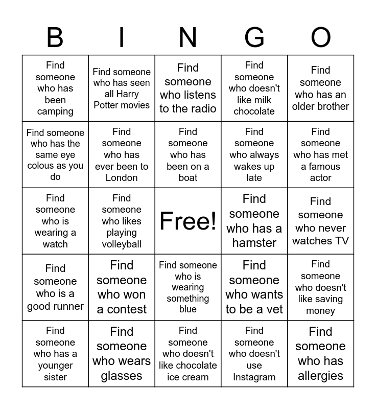 This bingo card has a free space and 24 words: Find someone who won a contest, Find someone who wears glasses, Find someone who has been on a boat, Find someone who has a younger sister, Find someone who has an older brother, Find someone who has been camping, Find someone who has the same eye colous as you do, Find someone who has seen all Harry Potter movies, Find someone who has a hamster, Find someone who is wearing something blue, Find someone who always wakes up late, Find someone who is wearing a watch, Find someone who wants to be a vet, Find someone who doesn't like saving money, Find someone who has ever been to London, Find someone who doesn't use Instagram, Find someone who never watches TV, Find someone who listens to the radio, Find someone who has met a famous actor, Find someone who likes playing volleyball, Find someone who has allergies, Find someone who is a good runner, Find someone who doesn't like milk chocolate and Find someone who doesn't like chocolate ice cream.