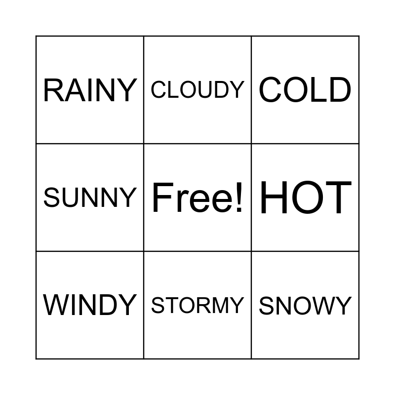 This bingo card has a free space and 8 words: HOT, COLD, CLOUDY, WINDY, RAINY, SNOWY, SUNNY and STORMY.