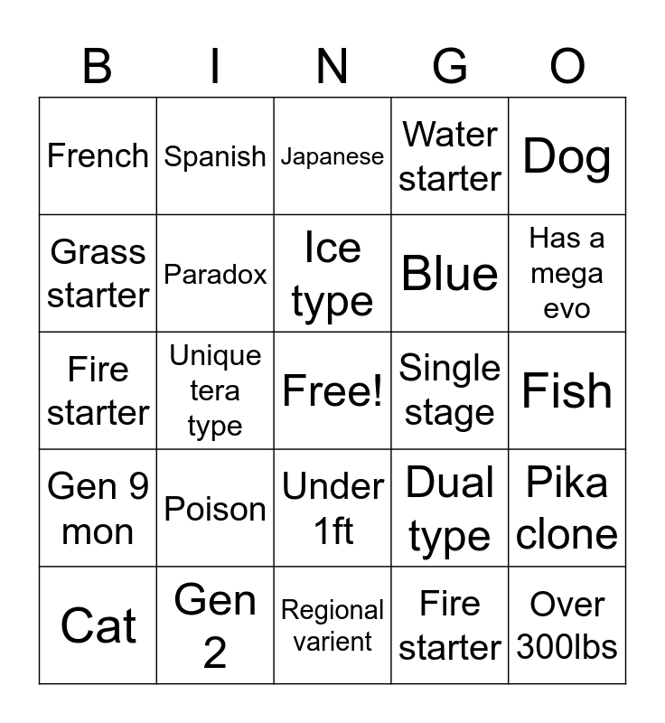 This bingo card has a free space and 24 words: Poison, Gen 2, Ice type, Cat, Dog, French, Grass starter, Spanish, Single stage, Under 1ft, Blue, Fire starter, Dual type, Pika clone, Paradox, Fire starter, Fish, Japanese, Has a mega evo, Unique tera type, Over 300lbs, Gen 9 mon, Water starter and Regional varient.