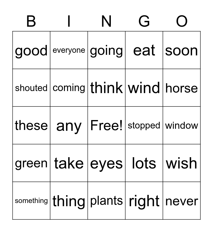 This bingo card has a free space and 168 words: way, fish, school, around, think, stop, another, boat, air, gone, rabbit, great, window, would, everyone, fox, king, through, baby, town, took, mouse, every, home, want, cat, round, animals, night, over, play, must, something, garden, take, bed, how, things, magic, next, small, new, shouted, first, car, man, after, top, wind, dark, thing, cold, park, lots, book, friends, once, white, why, sleep, bad, coming, cried, feet, tea, really, keep, morning, river, room, queen, eyes, wish, live, much, place,, under, hot, birds, suddenly, mother, hat, sun, duck, told, sat, horse, never, going, wanted, trees, hard, stopped, plants, before, ever, dragon, girl, looking, miss, pulled, clothes, which, most, tell, inside, fly, key, run, best, grow, long, tree, where, gave, right, still, eat, food, need, head, other, like, last, looks, because, box, please, use, even, green, along, different, water, bear, find, these, live, away, more, began, say, good, again, boy, soon, fast, thought, door, may, only, ran, many, know, sea, found, laughed, fun, work, each, fell, eggs, giant, jumped, snow, across, any and better.