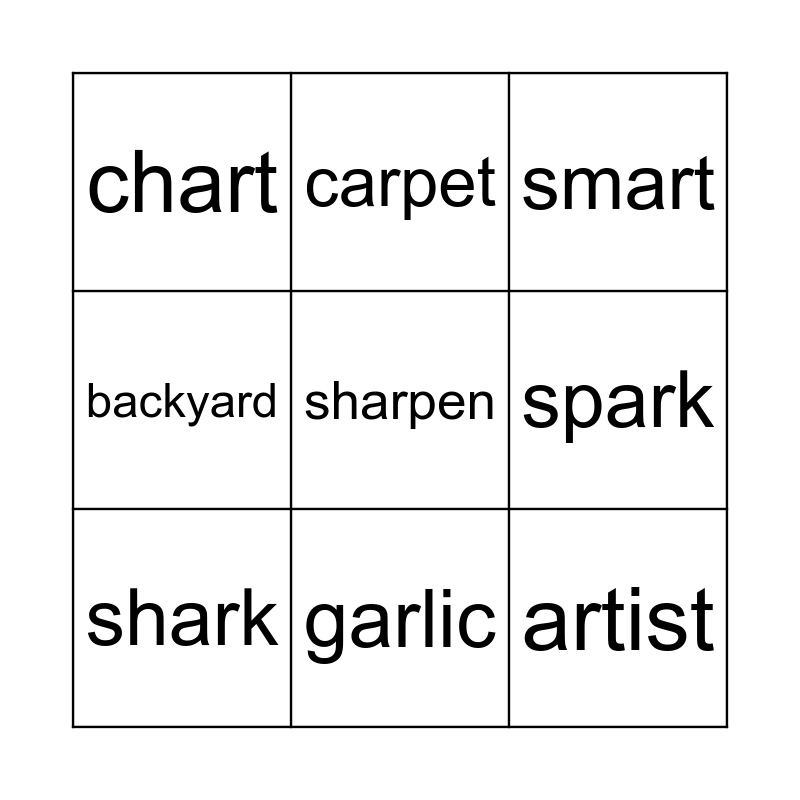 This bingo card has a free space and 8 words: spark, smart, carpet, shark, chart, artist, backyard and garlic.