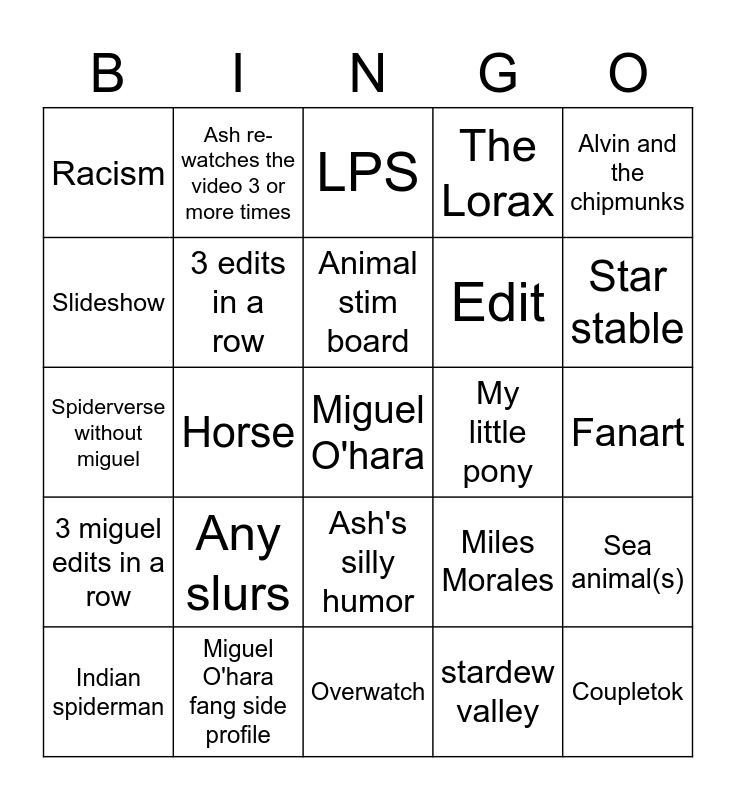 This bingo card has a free space and 24 words: Any slurs, Miguel O'hara fang side profile, Animal stim board, Indian spiderman, Alvin and the chipmunks, Racism, Slideshow, Ash re-watches the video 3 or more times, My little pony, Ash's silly humor, Edit, Spiderverse without miguel, Miles Morales, Sea animal(s), 3 edits in a row, stardew valley, Fanart, LPS, Star stable, Horse, Coupletok, 3 miguel edits in a row, The Lorax and Overwatch.