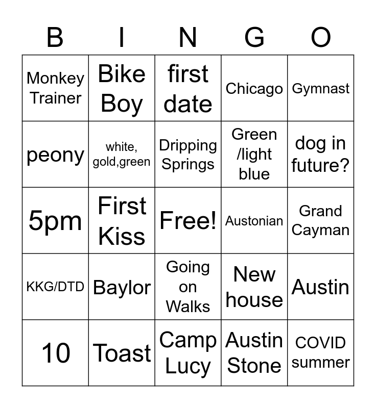 This bingo card has a free space and 24 words: Baylor, Toast, Dripping Springs, 10, Gymnast, Monkey Trainer, peony, Bike Boy, Austonian, Going on Walks, Green /light blue, 5pm, New house, Austin, white, gold,green, Austin Stone, Grand Cayman, first date, dog in future?, First Kiss, COVID summer, KKG/DTD, Chicago and Camp Lucy.