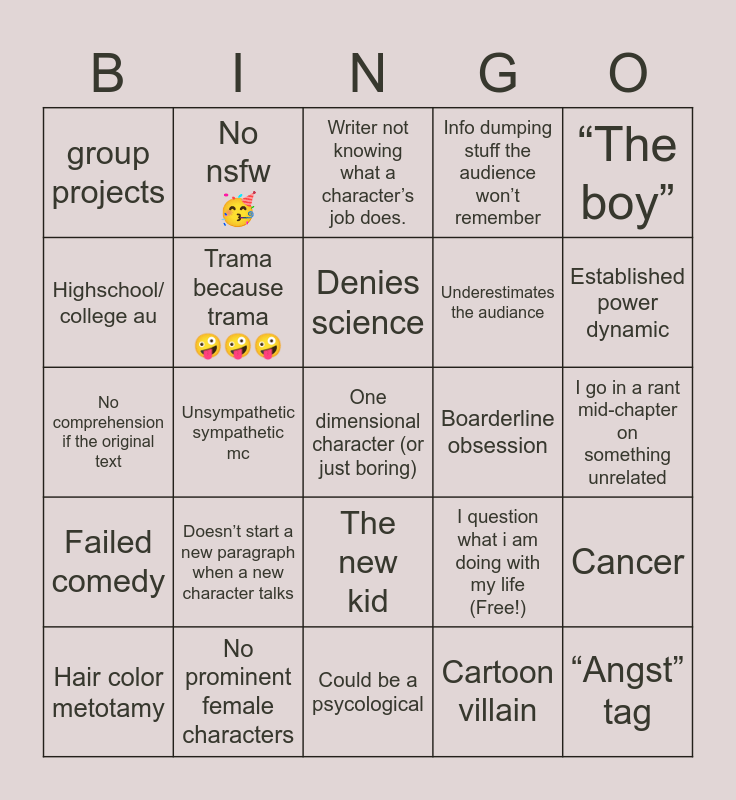 This bingo card has 25 words: Doesn’t start a new paragraph when a new character talks, Could be a psycological, Denies science, Hair color metotamy, “The boy”, group projects, Highschool/ college au, No nsfw 🥳, Boarderline obsession, The new kid, Underestimates the audiance, No comprehension if the original text, I question what i am doing with my life (Free!), Cancer, Trama because trama 🤪🤪🤪, “Angst” tag, I go in a rant mid-chapter on something unrelated, Writer not knowing what a character’s job does., Established power dynamic, Unsympathetic sympathetic mc, One dimensional character (or just boring), No prominent female characters, Failed comedy, Info dumping stuff the audience won’t remember and Cartoon villain.