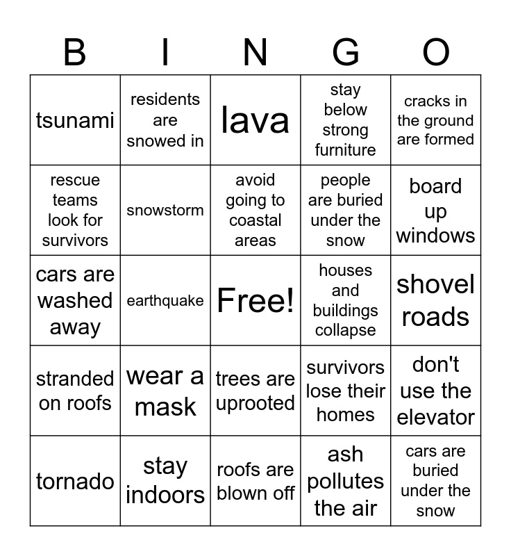 This bingo card has a free space and 29 words: tornado, avalanche, earthquake, volcanic eruption, tsunami, lava, snowstorm, wear a mask, houses and buildings collapse, stay indoors, shovel roads, cars are buried under the snow, roofs are blown off, ash pollutes the air, board up windows, residents are snowed in, trees are uprooted, stranded on roofs, cracks in the ground are formed, cars are washed away, survivors lose their homes, causes floods in cities, people are buried under the snow, rescue teams look for survivors, stay below strong furniture, residents are snowed in, don't use the elevator, avoid going to coastal areas and get to a safe place on higher ground.