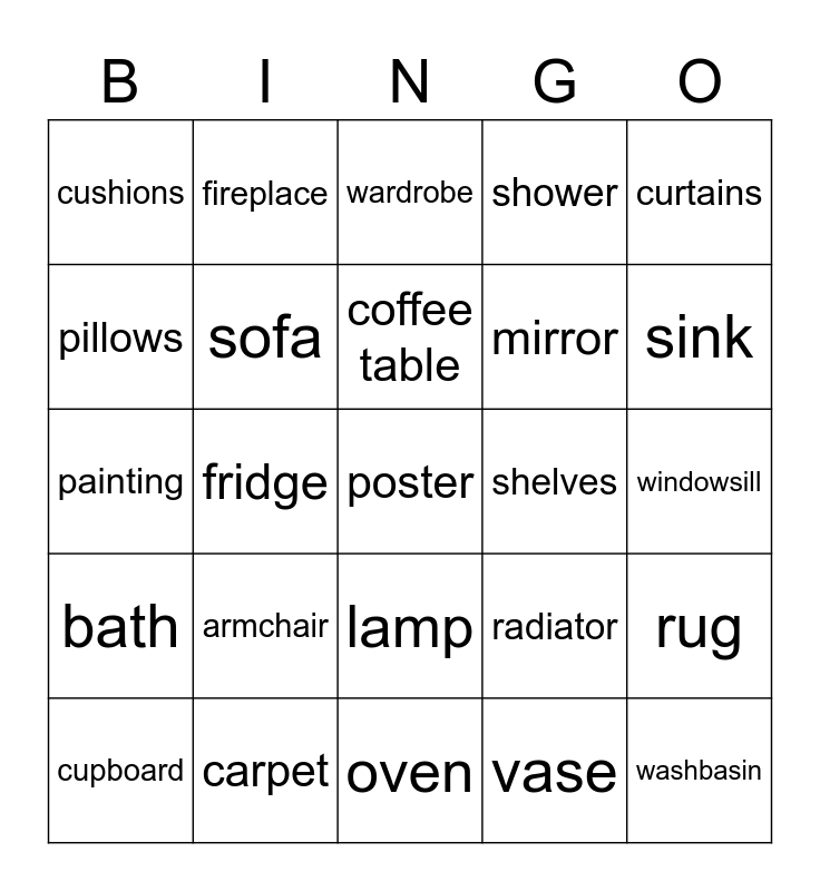 This bingo card has a free space and 24 words: armchair, carpet, coffee table, cupboard, curtains, cushions, pillows, fireplace, shelves, lamp, mirror, painting, radiator, rug, sofa, vase, windowsill, wardrobe, sink, fridge, washbasin, bath, shower and oven.