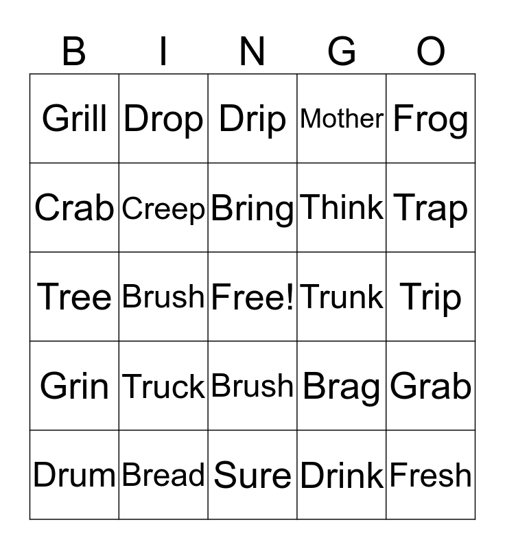 This bingo card has a free space and 24 words: Truck, Bread, Bring, Drum, Frog, Grill, Crab, Drop, Trunk, Brush, Think, Tree, Brag, Grab, Creep, Drink, Trip, Drip, Trap, Brush, Fresh, Grin, Mother and Sure.