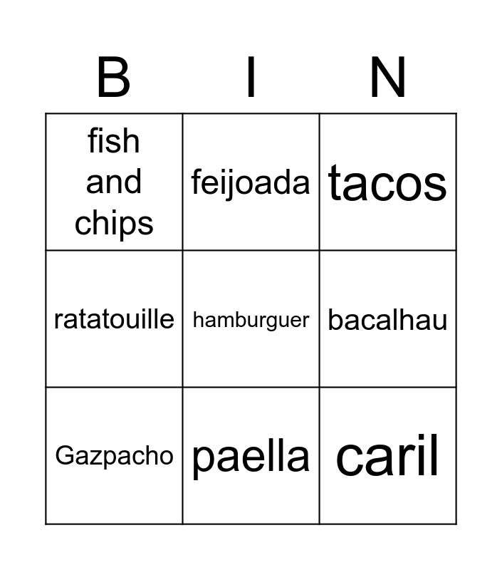 This bingo card has 12 words: lasanha, caril, hamburguer, bacalhau, feijoada, tacos, paella, sushi, fish and chips, ratatouille, Gazpacho and fransesinha.