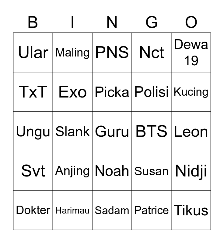 This bingo card has a free space and 24 words: Anjing, Harimau, Picka, Dokter, Dewa 19, Ular, TxT, Maling, BTS, Noah, Polisi, Ungu, Susan, Nidji, Exo, Patrice, Leon, PNS, Kucing, Slank, Tikus, Svt, Nct and Sadam.