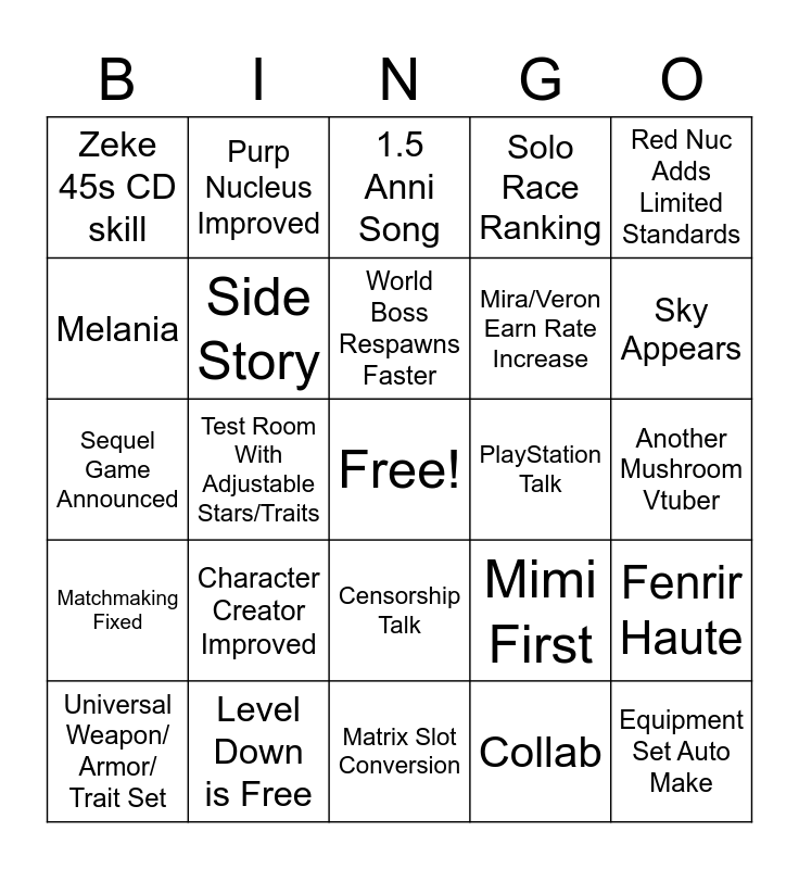 This bingo card has a free space and 24 words: Character Creator Improved, Level Down is Free, World Boss Respawns Faster, Universal Weapon/ Armor/ Trait Set, Red Nuc Adds Limited Standards, Zeke 45s CD skill, Melania, Purp Nucleus Improved, PlayStation Talk, Censorship Talk, Mira/Veron Earn Rate Increase, Sequel Game Announced, Mimi First, Fenrir Haute, Side Story, Collab, Another Mushroom Vtuber, 1.5 Anni Song, Sky Appears, Test Room With Adjustable Stars/Traits, Equipment Set Auto Make, Matchmaking Fixed, Solo Race Ranking and Matrix Slot Conversion.