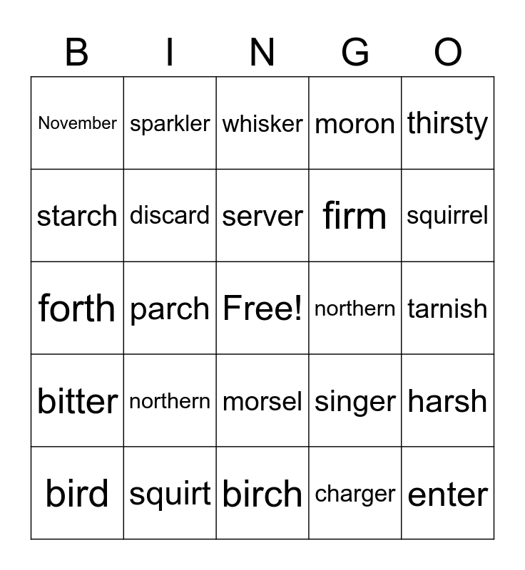 This bingo card has a free space and 29 words: bird, tender, parch, corridor, November, whisker, discard, northern, northern, squirt, tarnish, enter, birch, charger, squirrel, whirly, morsel, bitter, thirsty, forth, singer, harvest, firm, starch, moron, sparkler, harsh, server and skirting.