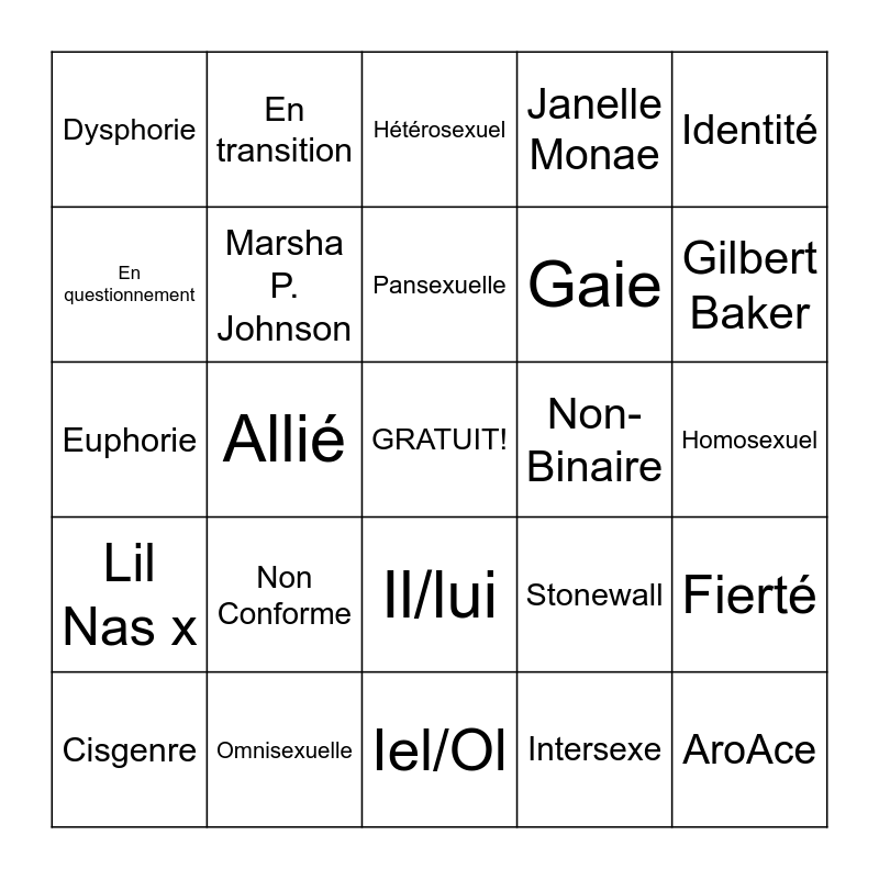 This bingo card has a free space and 24 words: Non Conforme, Omnisexuelle, Pansexuelle, Cisgenre, Identité, Dysphorie, En questionnement, En transition, Non-Binaire, Il/lui, Gaie, Euphorie, Stonewall, Fierté, Marsha P. Johnson, Intersexe, Homosexuel, Hétérosexuel, Gilbert Baker, Allié, AroAce, Lil Nas x, Janelle Monae and Iel/Ol.