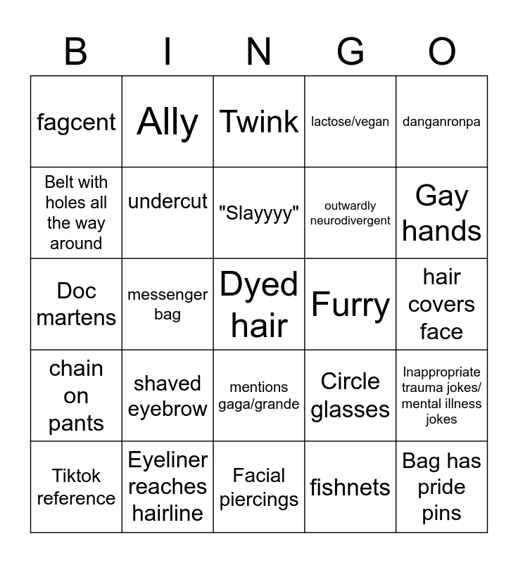 This bingo card has a free space and 24 words: shaved eyebrow, Eyeliner reaches hairline, "Slayyyy", Tiktok reference, danganronpa, fagcent, Belt with holes all the way around, Ally, Furry, mentions gaga/grande, outwardly neurodivergent, Doc martens, Circle glasses, Inappropriate trauma jokes/ mental illness jokes, undercut, fishnets, hair covers face, Twink, Gay hands, messenger bag, Bag has pride pins, chain on pants, lactose/vegan and Facial piercings.