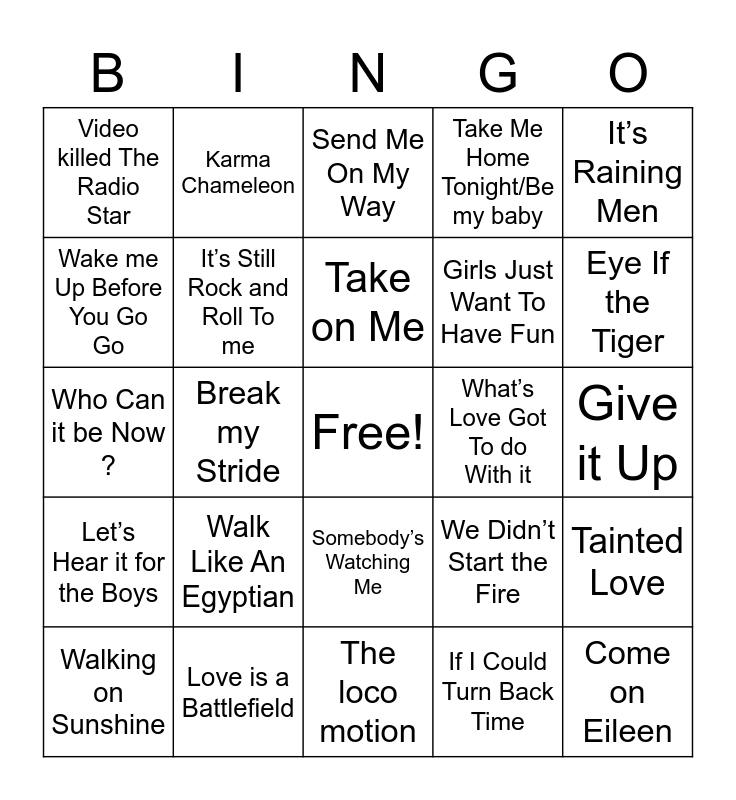 This bingo card has a free space and 64 words: Conga, La Bamba, Billie Jean, Tainted Love, Love Shack, I wanna Dance With Somebody, Karma Chameleon, The Way You Make Me Feel, Take on Me, Rhythm Of The Night, Somebody’s Watching Me, So Emotional, Give it Up, It’s Raining Men, Maniac, Wake me Up Before You Go Go, Break my Stride, Video killed The Radio Star, Ring My Bell, Girls Just Want To Have Fun, Walk Like An Egyptian, Let’s Hear it for the Boys, Take Me Home Tonight/Be my baby, Bad Reputation, Goody Two Shoes, Proud Mary, You Spin Me Round (like a record), Kids in America, I’m Still Standing, My Sharona, Don’t You ( Forget Me ), We Got the Beat, Uptown Girl, Kiss, Eye If the Tiger, Walking on Sunshine, (I’ve had ) The Time Of My Life, If I Could Turn Back Time, Gloria, It’s Still Rock and Roll To me, Who Can it be Now ?, What’s Love Got To do With it, Abracadabra, Higher Love, Modern Love, Come on Eileen, Love is a Battlefield, Jessie’s Girl, We Didn’t Start the Fire, Whip it, Hungry like a Wolf, 867-5309/Jenny, The loco motion, Centerfold, Rhythm is Gonna Get you, Mony Mony, Send Me On My Way, ( I just) Died in your arms tonight, I’m Every Woman, Bust A Move, It Takes Two, Apache, Planet Rock and The Breaks.