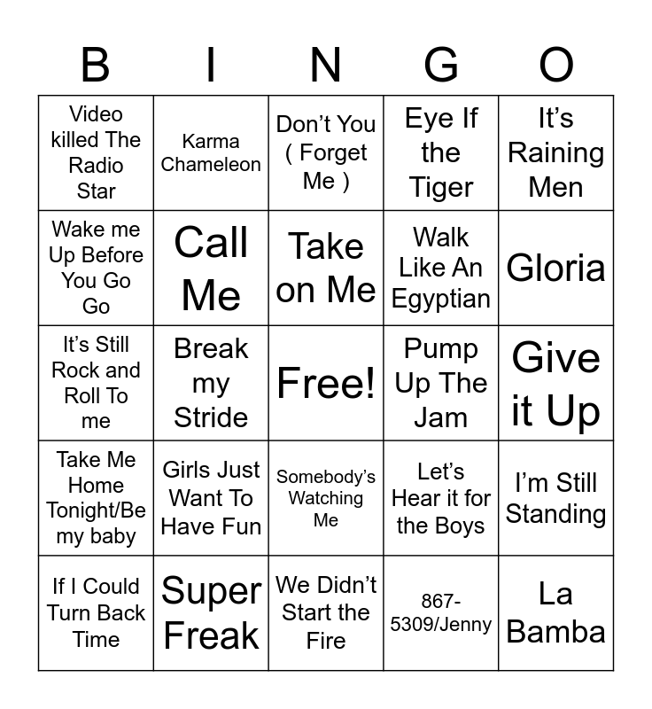 This bingo card has a free space and 68 words: Conga, La Bamba, Billie Jean, Tainted Love, Love Shack, I wanna Dance With Somebody, Karma Chameleon, The Way You Make Me Feel, Take on Me, Rhythm Of The Night, Somebody’s Watching Me, So Emotional, Give it Up, It’s Raining Men, Maniac, Wake me Up Before You Go Go, Break my Stride, Video killed The Radio Star, Ring My Bell, Girls Just Want To Have Fun, Walk Like An Egyptian, Let’s Hear it for the Boys, Take Me Home Tonight/Be my baby, Bad Reputation, Goody Two Shoes, Proud Mary, You Spin Me Round (like a record), Kids in America, I’m Still Standing, My Sharona, Don’t You ( Forget Me ), We Got the Beat, Uptown Girl, Kiss, Eye If the Tiger, Walking on Sunshine, (I’ve had ) The Time Of My Life, If I Could Turn Back Time, Gloria, It’s Still Rock and Roll To me, Who Can it be Now ?, What’s Love Got To do With it, Call Me, White Wedding, Gimme! Gimme!Gimme!, Venus, We Built This City, Don’t You Want Me, Pump Up The Jam, Super Freak, Abracadabra, Love is a Battlefield, Jessie’s Girl, We Didn’t Start the Fire, Whip it, Hungry like a Wolf, 867-5309/Jenny, The loco motion, Centerfold, Rhythm is Gonna Get you, Mony Mony, Send Me On My Way, I’m Every Woman, Bust A Move, It Takes Two, Apache, Planet Rock and The Breaks.