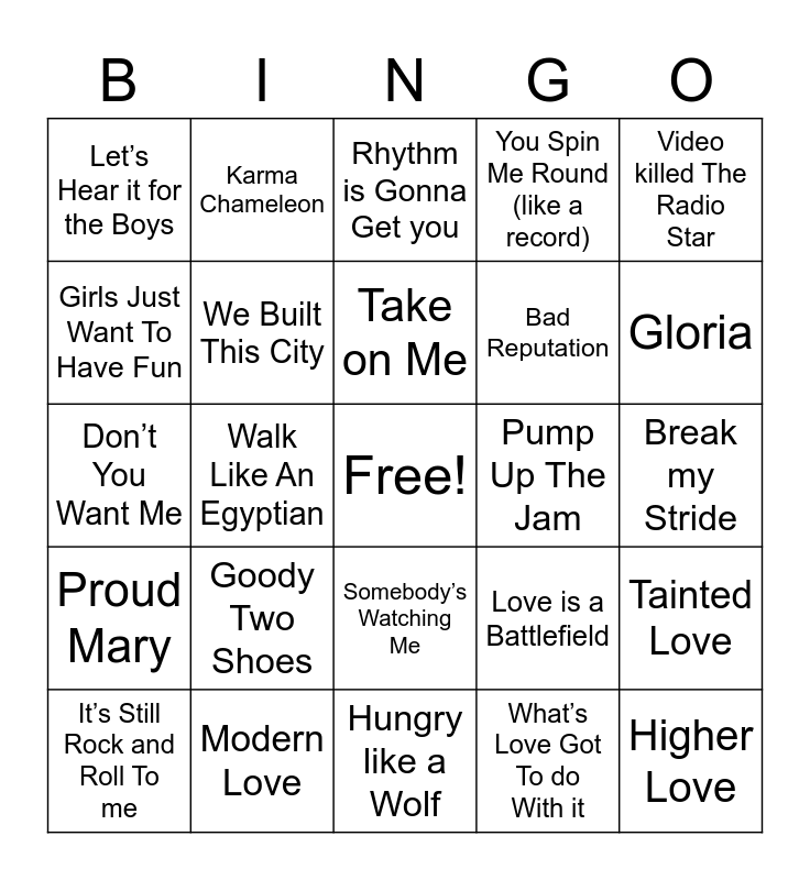 This bingo card has a free space and 63 words: Conga, La Bamba, Billie Jean, Tainted Love, Love Shack, I wanna Dance With Somebody, Karma Chameleon, The Way You Make Me Feel, Take on Me, Rhythm Of The Night, Somebody’s Watching Me, Wake me Up Before You Go Go, Break my Stride, Video killed The Radio Star, Ring My Bell, Girls Just Want To Have Fun, Walk Like An Egyptian, Let’s Hear it for the Boys, Take Me Home Tonight/Be my baby, Bad Reputation, Goody Two Shoes, Proud Mary, You Spin Me Round (like a record), Kids in America, I’m Still Standing, My Sharona, Don’t You ( Forget Me ), We Got the Beat, Uptown Girl, Kiss, Eye If the Tiger, Walking on Sunshine, (I’ve had ) The Time Of My Life, If I Could Turn Back Time, Gloria, It’s Still Rock and Roll To me, Who Can it be Now ?, What’s Love Got To do With it, Venus, We Built This City, Don’t You Want Me, Pump Up The Jam, Super Freak, Abracadabra, Higher Love, Modern Love, Come on Eileen, Love is a Battlefield, Jessie’s Girl, We Didn’t Start the Fire, Whip it, Hungry like a Wolf, 867-5309/Jenny, The loco motion, Centerfold, Rhythm is Gonna Get you, Mony Mony, Send Me On My Way, ( I just) Died in your arms tonight, It Takes Two, Apache, Planet Rock and The Breaks.
