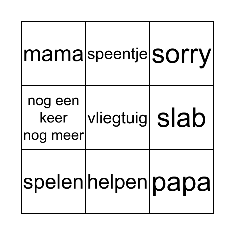 This bingo card has a free space and 8 words: slab, sorry, speentje, spelen, mama, papa, nog een keer nog meer and helpen.